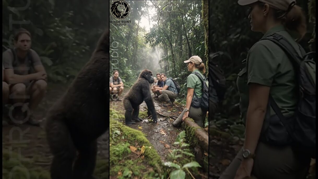 A Gentle Encounter: Juvenile Mountain Gorilla’s Curious Moment with Tourists #wildlife #viralvideo