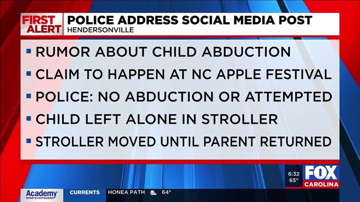 Police address rumors of child abduction at NC Apple Festival Dr. Michael Bomar April 3, 2026 Leave a Comment on Police address rumors of child abduction at NC Apple Festival Posted in Seen Them Share: XFacebookPinterestLinkedin The Hendersonville Police Department is addressing a post circulating on social media and is investigating the allegation. source Author: Dr. Michael Bomar
